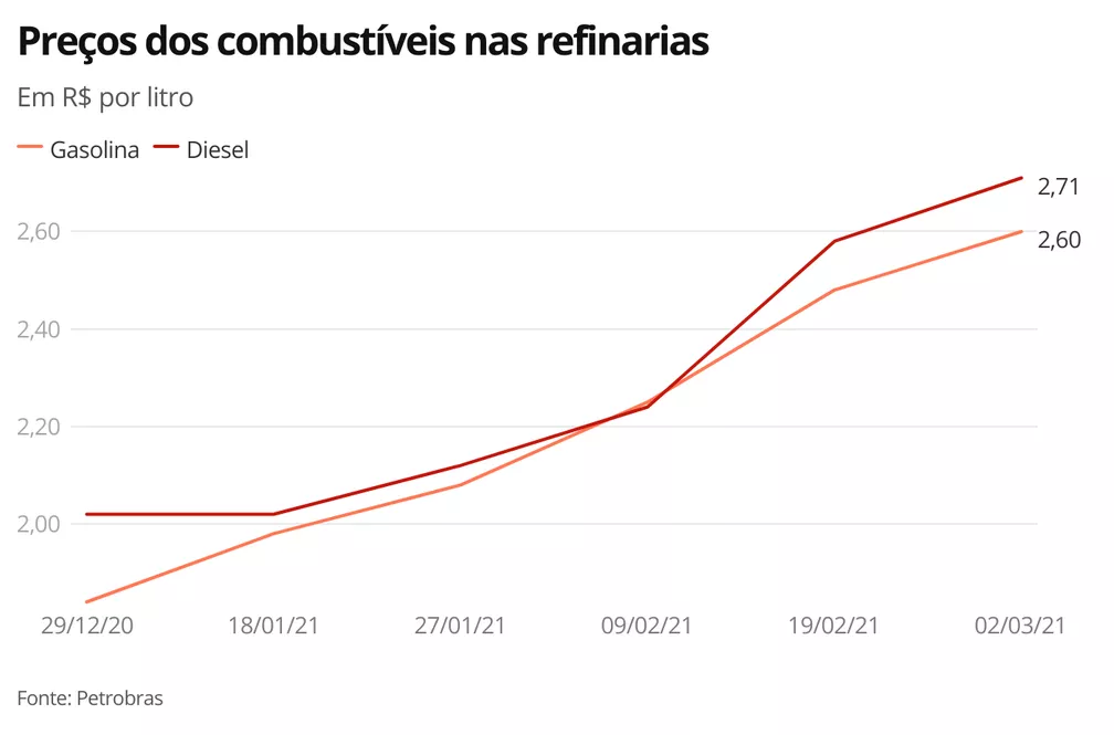 As sucessivas altas nos combustíveis este ano irritaram o presidente Jair Bolsonaro, que indicou o general Joaquim Silva e Luna para substituir o atual presidente Roberto Castello Branco do comando da estatal, como mostra o vídeo abaixo. O mandato de Castello Branco, no entanto, termina em 20 de março, e ele segue no cargo.